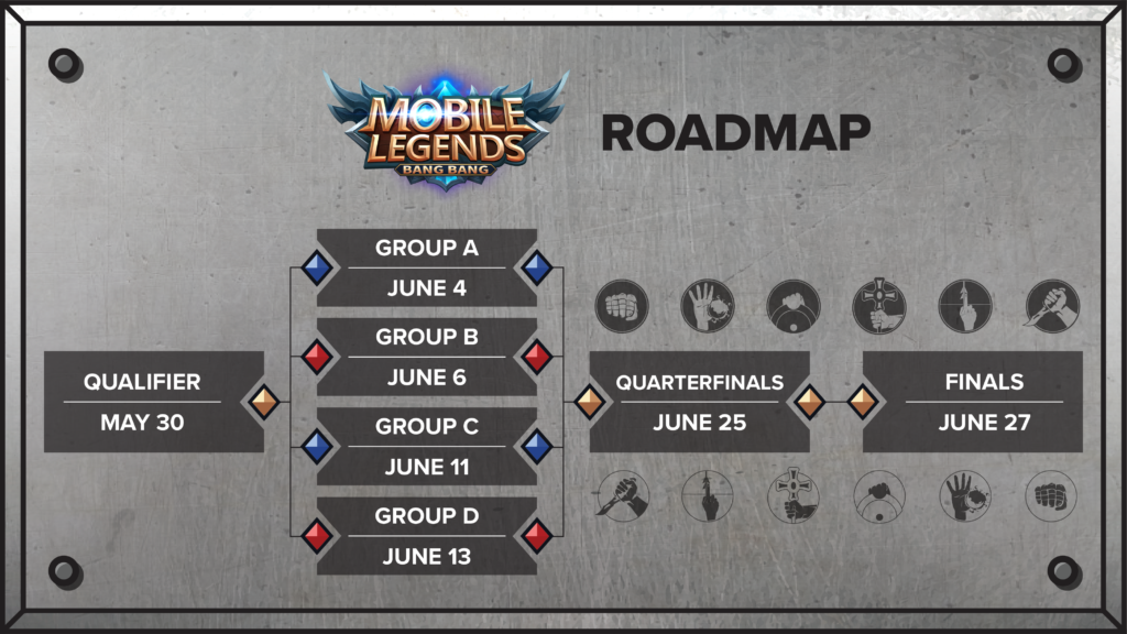 - Qualifier: single elimination, all matches are Bo1. Top 2 teams will advance to the mall event.